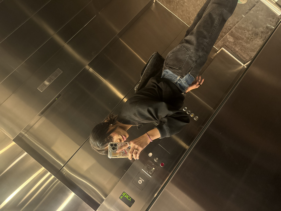 The image depicts a modern elevator interior in Mexico City, Mexico. The scene is a tilted, eye-level selfie taken by an individual in the reflective, brushed stainless steel elevator walls. The elevator features a control panel on the left side, displaying a backward reflection of "EMERGENCY" and the numeral "1." The floor is a patterned, possibly stone or tile, surface. A single individual, appearing to be a young adult female with dark hair, stands slightly angled. She wears a black long-sleeved top, two-tone black and blue denim jeans, and a dark cross-body bag with a chain strap. Her left hand holds a clear-cased smartphone to capture the reflection. She exhibits a subtle smile and wears a ring on her left ring finger, a pink braided bracelet on her left wrist, and small, light-colored earrings. The individual is actively engaged in taking the photograph.