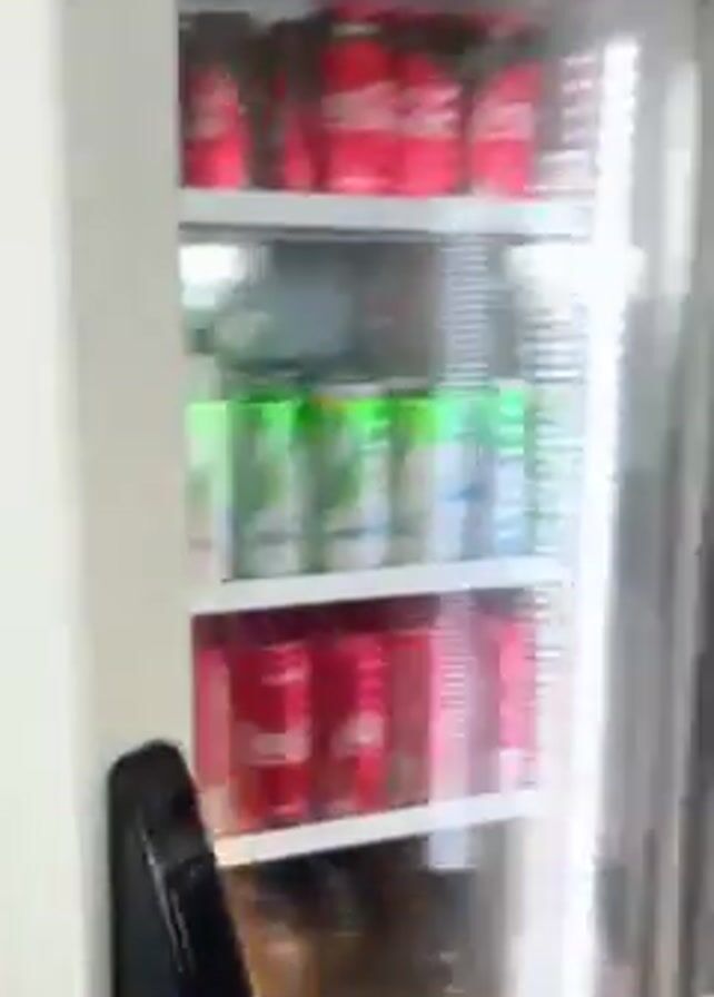 - ". The video begins with a close-up shot of a refrigerated display case, stocked with beverages like Sprite, Coca-Cola, and juices. A hand wearing a black jacket opens the door. The video then cuts to another shot of the display case, showing it's one in a row of several. The person selects a Coca-Cola Zero can and exits the refrigerator. Next, the video pans around, revealing a modern, well-lit space. There's a bar with bar stools along a row of large windows that offer a cityscape view." by FM-mfRp53, licensed under CC BY 4.0