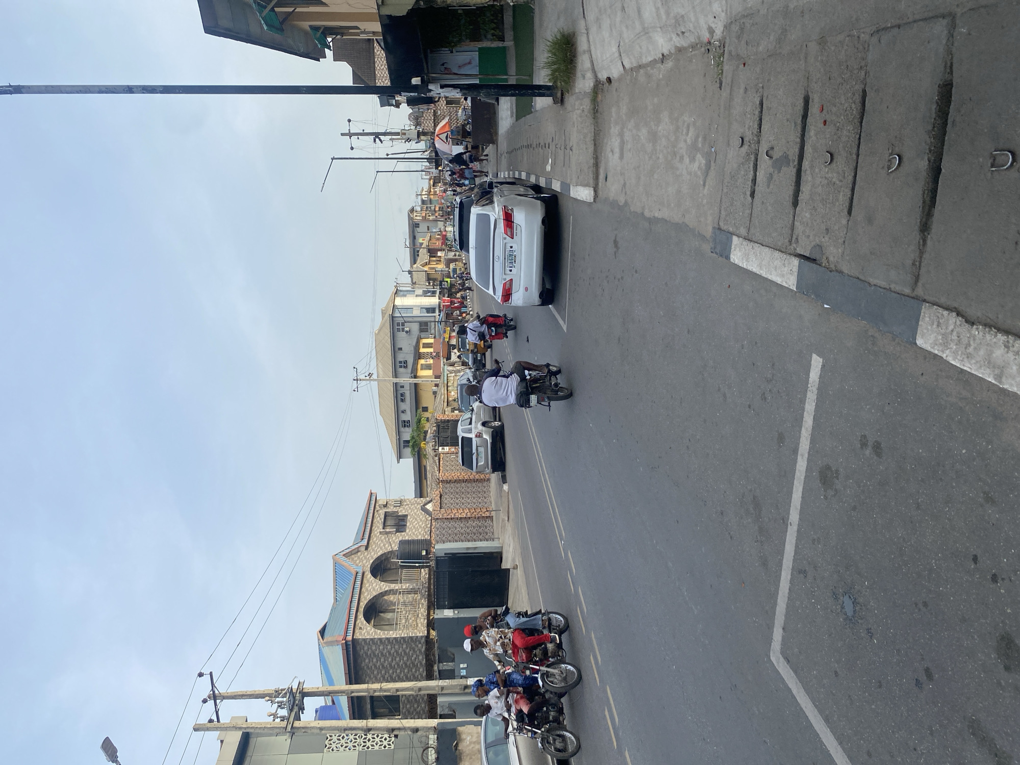 The image depicts a street scene in Akowonjo, Nigeria. The street is moderately busy with both vehicular and pedestrian traffic. Several motorcycles, each carrying multiple passengers, are navigating the roadway. A white car is parked along the side of the road. Buildings of varying heights and architectural styles line both sides of the street. Overhead, power lines stretch across the sky. The sky itself is overcast. The road surface is asphalt, showing signs of wear and tear, with painted lane markings visible. The sidewalk features concrete paving and a curb.