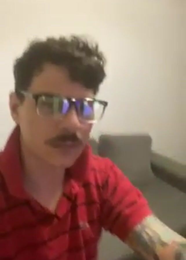 person in a red-striped polo shirt and glasses with a mustache, looking directly at the camera. The person has curly brown hair and a tattoo on their left arm. They are sitting, likely on a couch or chair, in what appears to be a living room. Behind them is a gray couch, a hardwood floor in a herringbone pattern, and a wall with a lamp. On a table next to the person, there are several items including a remote control, a mouse, and a small container. The camera angle suggests the video is a selfie or being filmed at close range. The room appears to be well-lit.