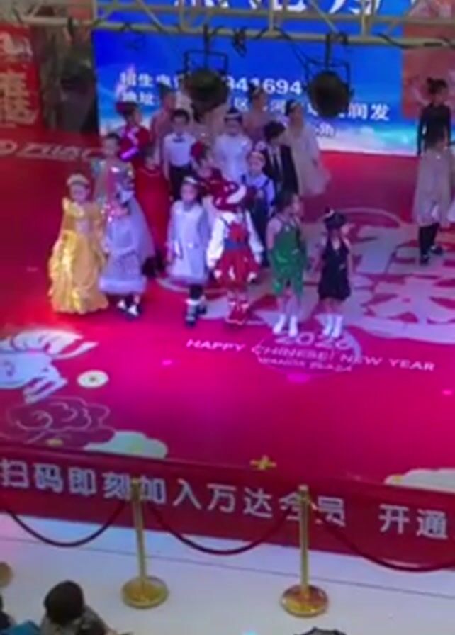 A group of children in costumes are on a red stage with the words "HAPPY CHINESE NEW YEAR 2023 WANDA PLAZA"