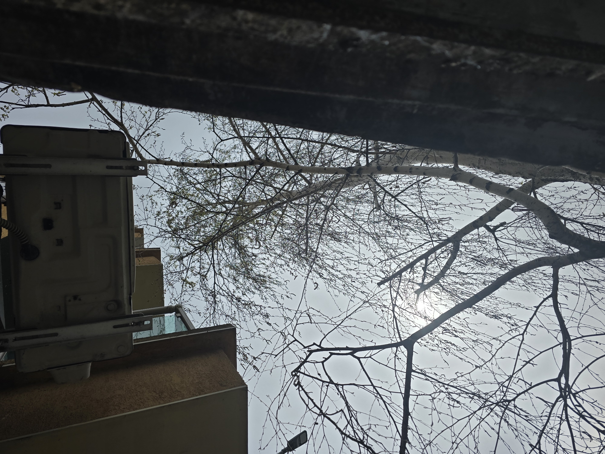 low-angle view looking up, partially obscured by an overhead structure