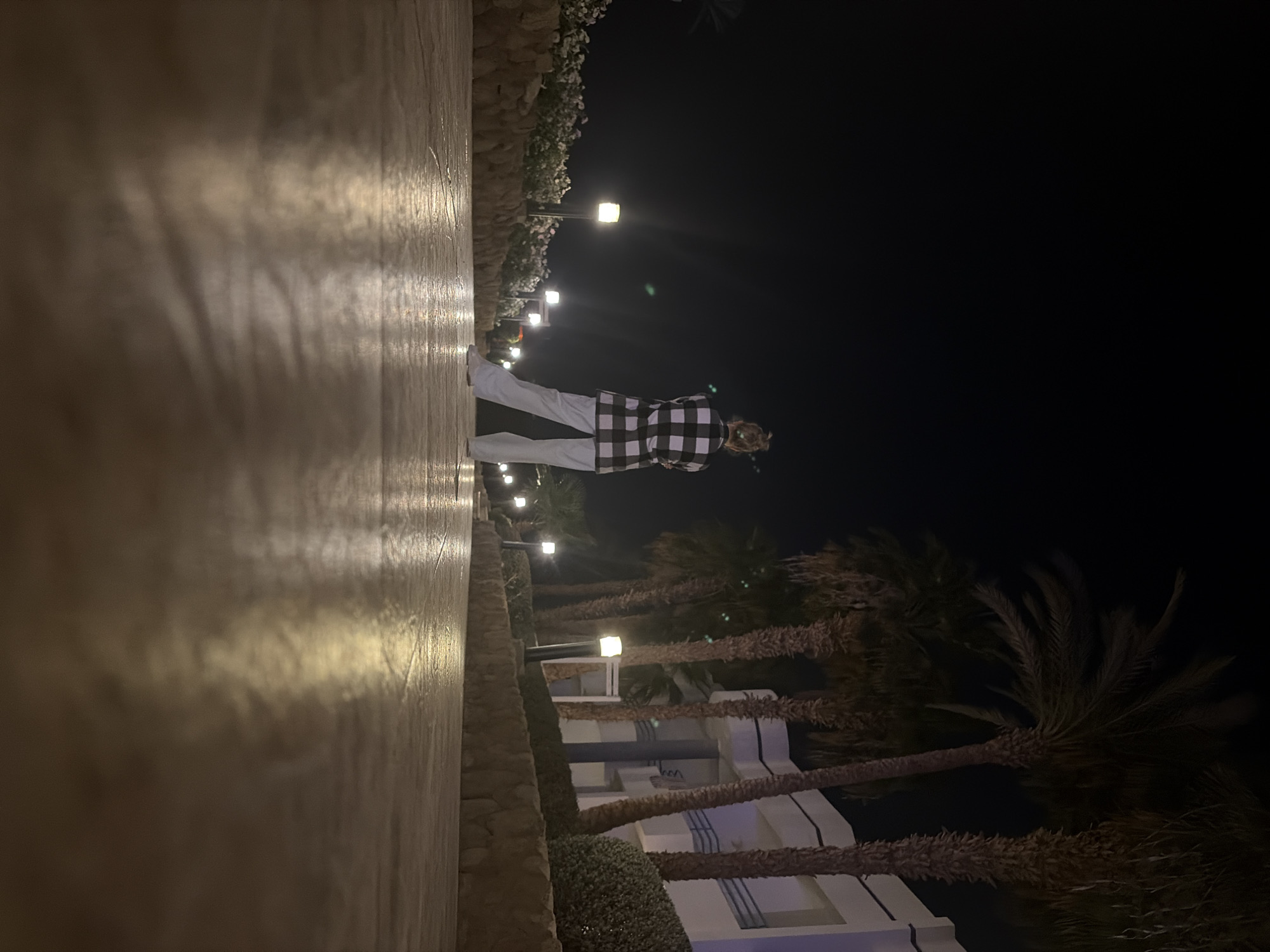 At night in Sharm El Sheikh, Egypt, a person wearing light-colored pants and a black and white checkered shirt stands along a lit walkway