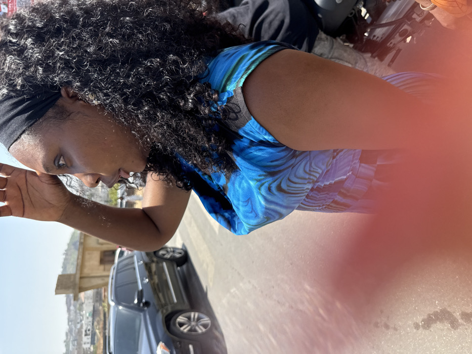 A dark-complexioned female is depicted outdoors in Guzape, Nigeria, under bright sunlight