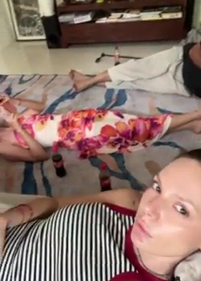 three people lying on a rug in a room. One woman is in the foreground, wearing a striped tank top and red trim. She is smiling at the camera. Another woman is lying on the rug wearing a white dress with pink and orange flowers. A man is lying on the rug as well, wearing white pants, a black shirt, and a white baseball cap. He is using a cell phone. There are three bottles of Coca-Cola on the rug. A low wooden cabinet is in the background, along with a television and speakers. The rug has blue and white designs. The woman in the foreground adjusts her position as the video ends.