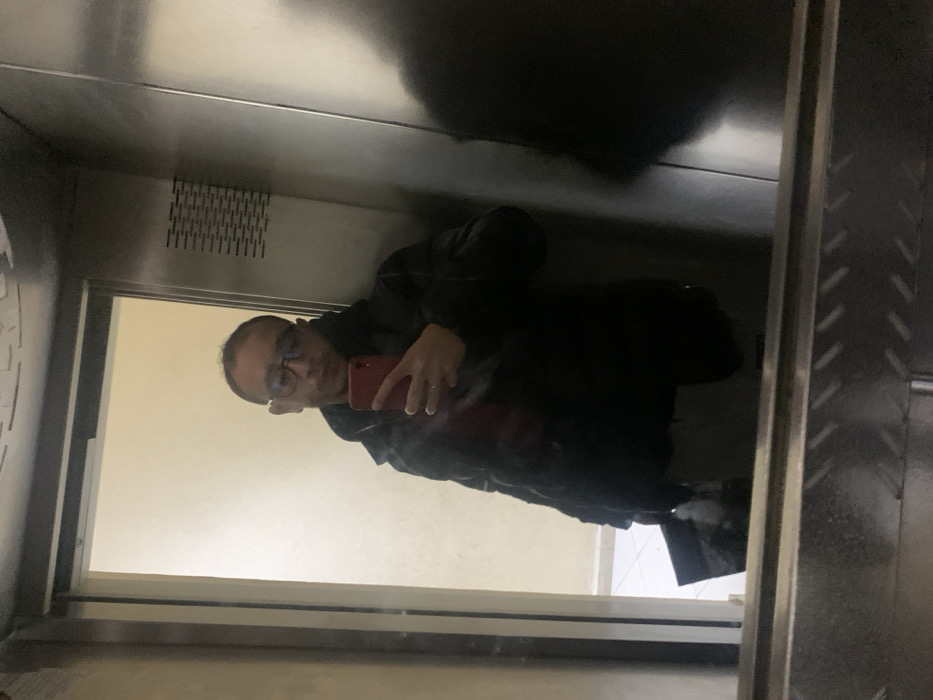 - "In a mirrored elevator, a person wearing glasses and a dark jacket holds a red phone, taking a selfie" by FM-48sj32, licensed under CC BY 4.0