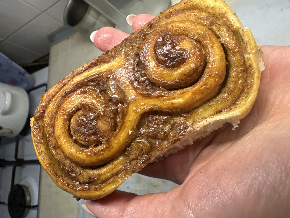 - "The scene, located in Kamianske, Ukraine, depicts a human hand holding an elongated, irregularly shaped cinnamon roll" by FM-cOgJG3, licensed under CC BY 4.0