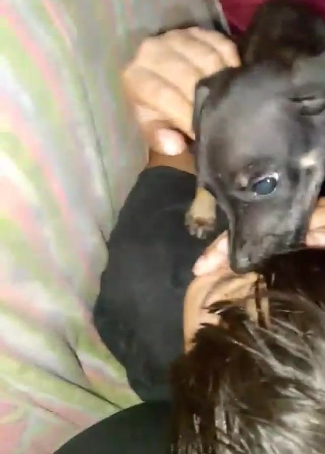 - ". The video shows a young puppy biting at the face of a child or young adult, who is lying on a bed with striped sheets. The puppy is mostly black with some brown markings, and is being held by someone whose hands are visible in the shot. The puppy seems playful but is nipping at the person's forehead and face. The person appears to be on their back or side. Some clothing is visible, including a maroon shirt with white stripes on the shoulder and black pants. The lighting is somewhat dim. The audio includes speech, as someone says "No, hijo."" by FM-Nsq882, licensed under CC BY 4.0
