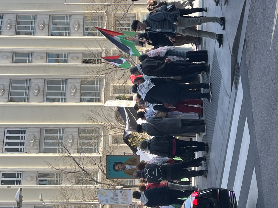 The image captures an outdoor gathering of approximately 25-35 individuals on a wide urban sidewalk in Madrid, Spain, under clear, sunny conditions. The background is dominated by a multi-story building with a light-colored facade, characterized by numerous uniformly spaced windows, each featuring a distinctive semi-circular, fan-like architectural embellishment above it. This architectural style is typical of major thoroughfares in central Madrid, such as Gran Vía. The individuals, primarily adults, are standing in a concentrated group. Many are wearing keffiyehs or scarves with similar black, white, and red patterns around their necks or heads. Several participants are holding upright Palestinian flags, identifiable by their horizontal black, white, and green stripes with a red triangle at the hoist. Two large posters are visible. One prominent poster displays a painted portrait of a woman, possibly a historical figure, with partially legible text below her that appears to read "ACTUA DE..." Another poster is partially obscured by the crowd. Bare tree branches are visible, indicating a late autumn or winter season. In the immediate foreground, a section of a black vehicle is visible on the left, parked adjacent to a clearly marked zebra crossing on the street. The gathering appears to be a peaceful demonstration or rally.