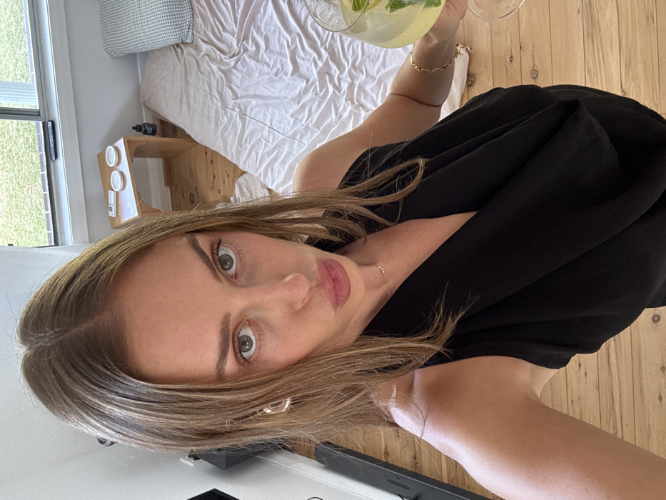 A woman poses for a selfie, holding a drink. She has light brown hair, green eyes, and light skin. She's wearing a black dress and a necklace. A hexagonal earring is visible on her left ear. In the background, there's a bed with white linens, a wooden bedside table, and a window. A wooden floor is beneath her.