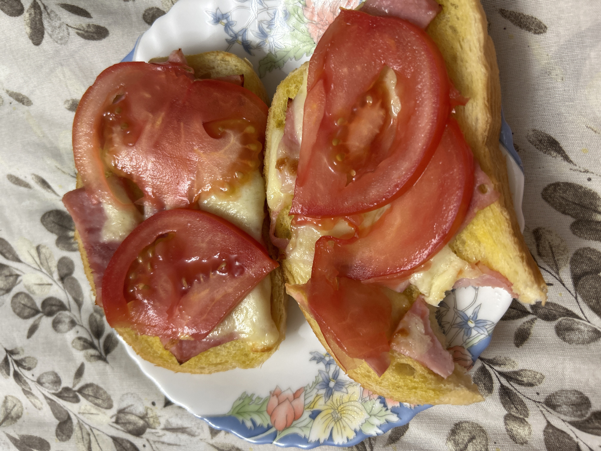 Two open-faced sandwiches are presented on a patterned plate, resting on a fabric surface. Each sandwich consists of toasted bread topped with slices of cheese, ham, and tomato. The tomatoes are sliced thinly and arranged on top. The plate features a floral design with a blue rim. The patterned fabric beneath is predominantly white with dark gray leaf-like designs and floral accents. The location is not discernible from the image.