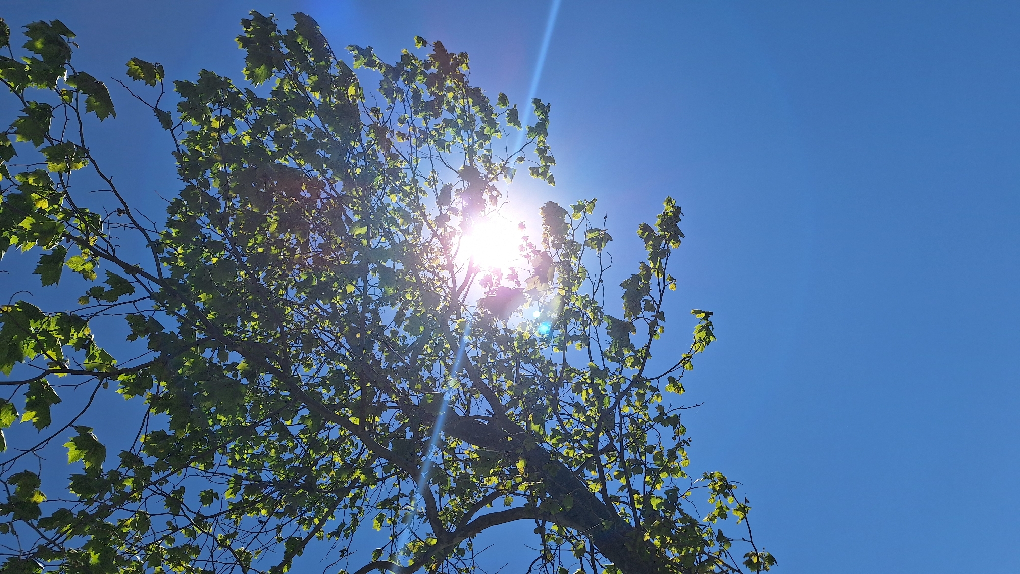 A low-angle, daytime shot shows a tree with light green leaves silhouetted against a bright blue sky, with the sun shining through the leaves, creating lens flares