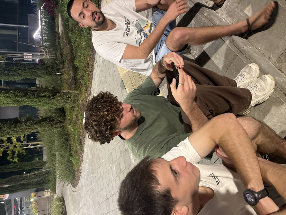 Three males are seated outdoors on a light grey paved surface at night in Modiin-Maccabim-Reut, Israel