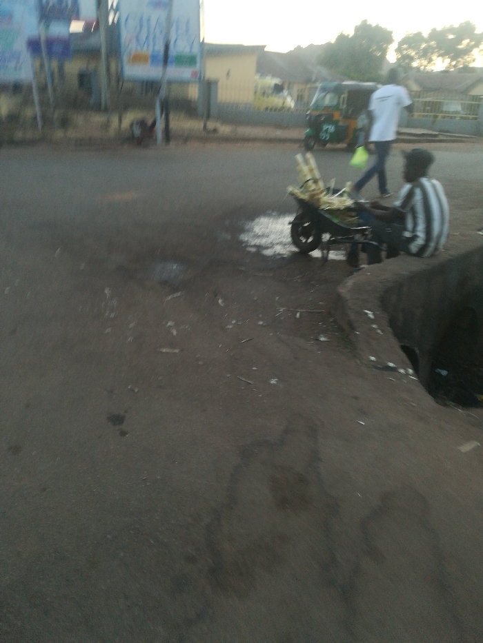 An urban scene features a man in a striped shirt sitting beside a wheelbarrow laden with stalks, possibly sugarcane. A person in white walks by. In the background, there's a parked auto-rickshaw and buildings behind a billboard. The road is weathered with dark patches and a puddle, suggesting recent rain. The image has an unrefined, documentary feel.