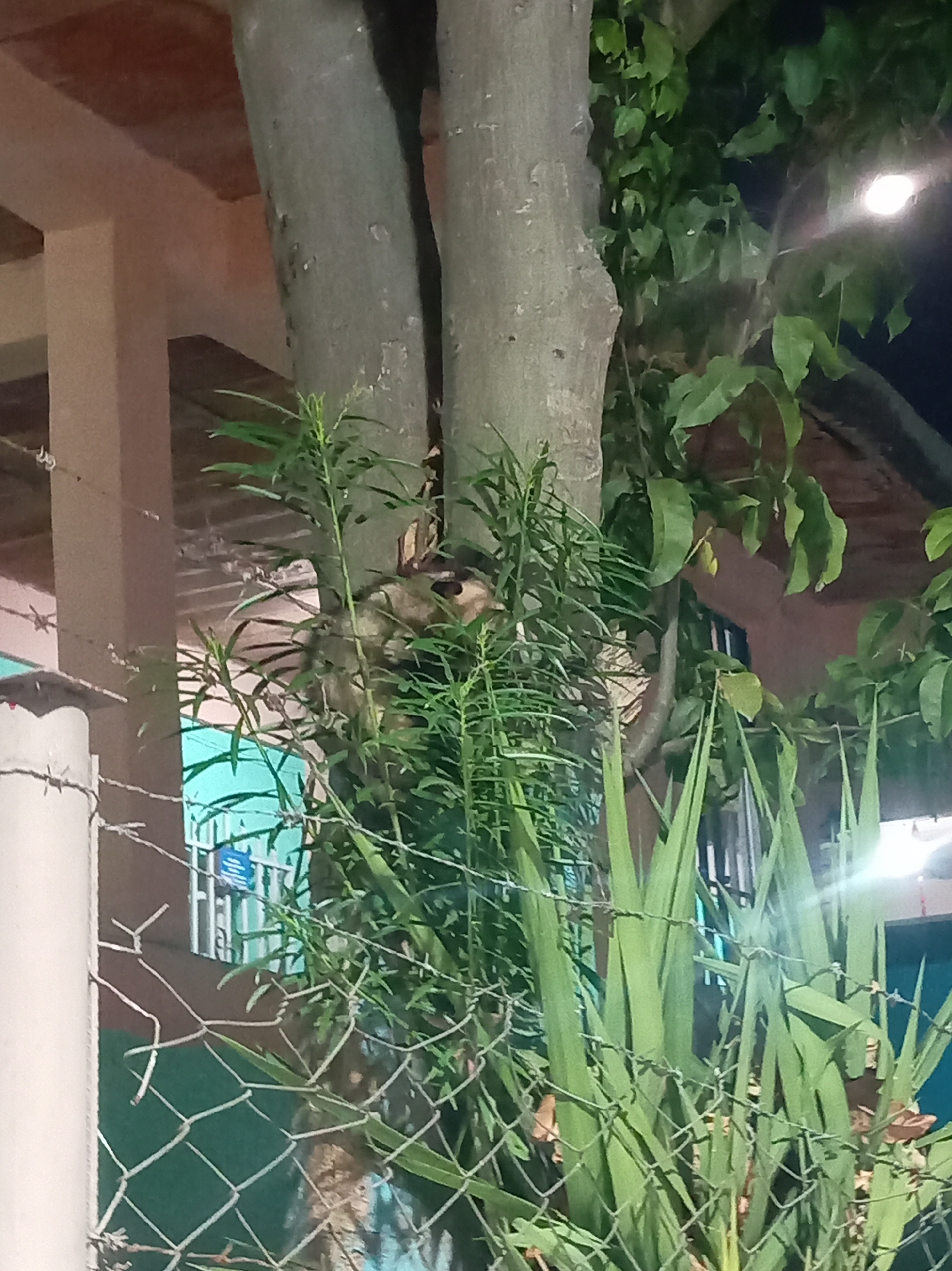 The image depicts a night scene in Las Tejerías, Venezuela, with a tree as the central element. The tree, composed of two trunks, is partially obscured by dense green foliage, including thin, needle-like leaves and broad, sword-shaped leaves. A chain-link fence runs along the left side of the image. Behind the tree and fence are glimpses of buildings. The area is illuminated by an artificial light source located in the upper right of the frame. A small animal, possibly a squirrel, rests in the foliage between the tree trunks.