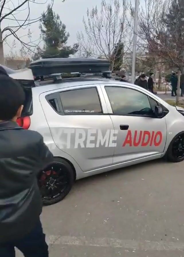 light silver car with the words "EXTREME AUDIO" in large red letters on its side. The car has black wheels and a roof rack, and a large custom-built speaker system attached to the back, with a box containing additional speakers on the ground nearby. Several people are standing around the car, including a young boy who is taking pictures with his phone. One man in a gray jacket is looking toward the camera, and others are milling about. The scene is an outdoor parking area, with bare trees and buildings in the background. The video appears to be documenting the sound system installed on the car.