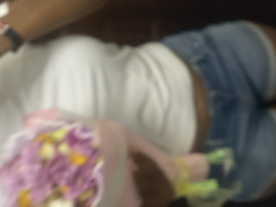 The severely blurred image, captured in Thika, Kenya, displays the mid-torso and partial limbs of an individual. The subject wears a white, form-fitting top and blue denim shorts. A dark-skinned right arm is partially visible, with a dark-colored wristwatch present on the wrist. A bouquet of flowers, primarily purple and yellow in color, is held by the subject's obscured left hand. The flowers are wrapped in light pink paper, with a green element securing the base. The background is uniformly dark and indistinct. No specific actions or interactions beyond holding the bouquet are discernible.