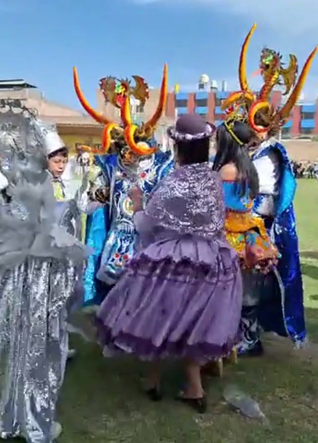 group of people in colorful costumes dancing on a grassy field, under a blue sky. Several buildings are visible in the background. The dancers are wearing elaborate costumes, including horned masks, capes, and decorative dresses. One costume features large silver wings. A woman in a purple dress and hat is seen dancing with them. A person in jeans and a green shirt stands nearby, taking pictures with a camera. Other people can be seen in the background, suggesting a larger event or celebration is taking place.
