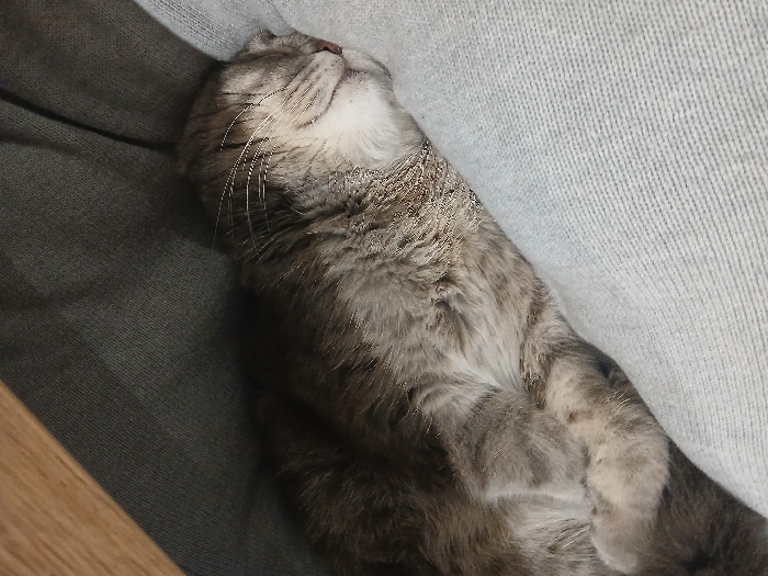 - "A grey and white mottled domestic cat is observed sleeping soundly, curled on its right side, within a light grey knitted fabric, possibly a blanket or pet bed" by FM-GqrYX2, licensed under CC BY 4.0
