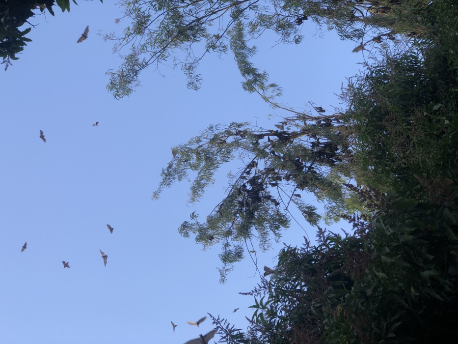 A view looking up at a clear blue sky punctuated by several bats in flight. Trees frame the scene; one group dense with leaves and branches on the right, and a thinner, more delicate branch with hanging leaves stretching across the top. Numerous bats cluster in the branches of the latter tree. The overall composition is bright, airy and natural.