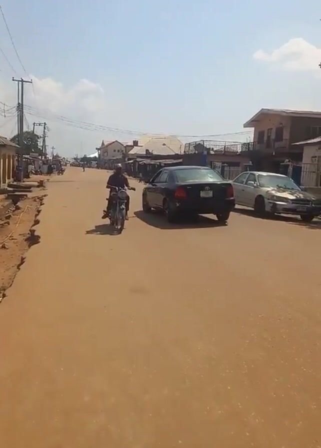 street scene in a town or small city. The road is paved with a reddish-brown material and has a worn or cracked appearance. There are buildings on either side of the road, some appearing to be houses and others possibly businesses. Power lines run overhead along the street. Several vehicles, including cars and motorcycles, are visible, some moving along the road and others parked. There is a makeshift stand with an umbrella on the side of the road, possibly a vendor. The day is sunny, and the sky is mostly clear with some light clouds. The general impression is of a relatively quiet and unpaved street in a developing area.