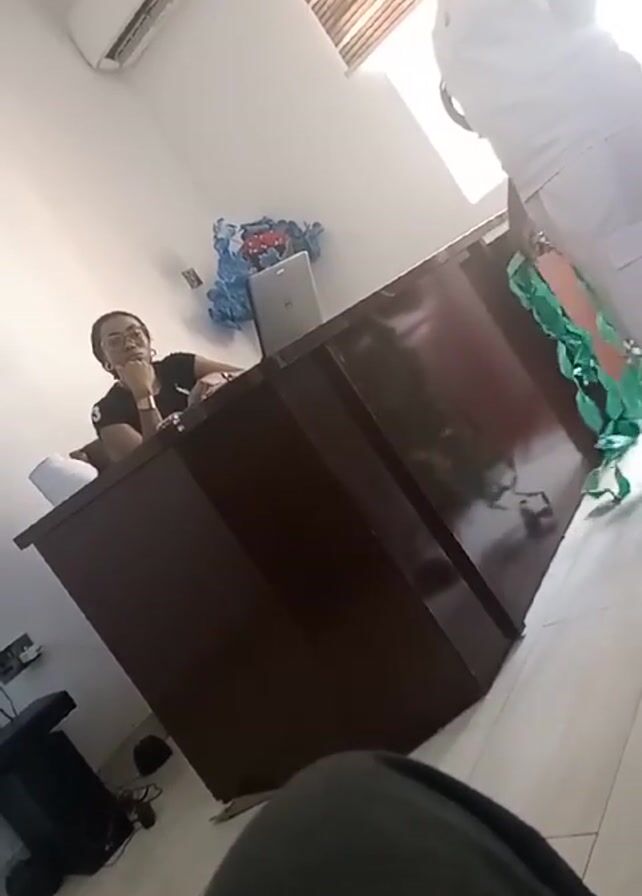 room with bright lighting. A woman is seated at a dark wooden desk, working on a laptop and wearing glasses. A woman in a white uniform stands near the desk, holding green decorations. The view is from a seated position of someone wearing dark pants. An air conditioning unit is mounted high on the wall. There is also a window with horizontal blinds in the upper right of the frame.