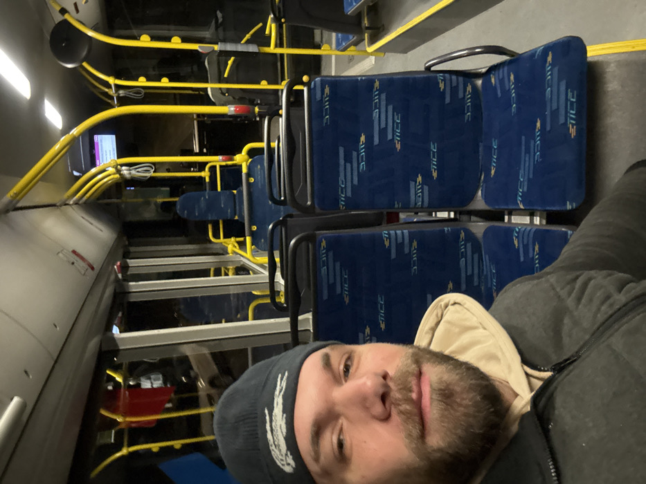 A selfie on a bus shows a person wearing a black beanie with a white alligator logo, a tan hoodie, and a gray jacket. Behind the person are blue patterned bus seats with black handles and yellow safety bars. The aisle of the bus stretches back, revealing windows and more seats. The lighting appears dim, and the perspective is tilted.