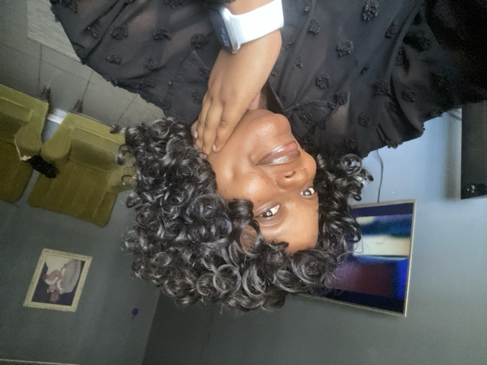 An adult female is depicted in a close-up, front-facing indoor portrait, likely a selfie
