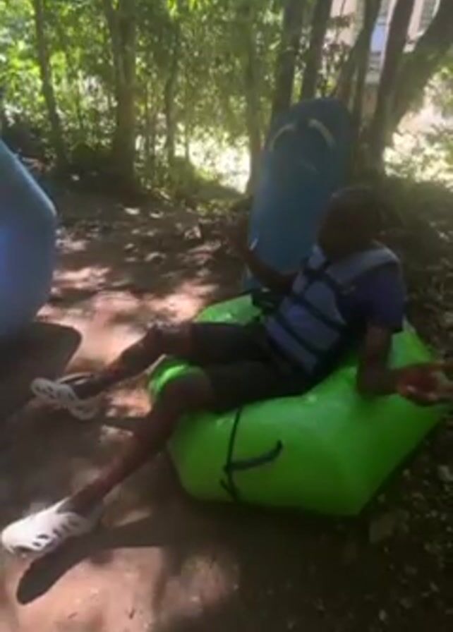 A man, wearing a blue shirt, black shorts, a blue life vest, and white shoes, sits on a green inflatable chair. He is positioned on a dirt ground surrounded by trees, with sunlight filtering through the leaves. There is another blue inflatable object and a paddle board behind him. He is gesturing with his hands. He seems to be talking about the river which he says is moving very fast.