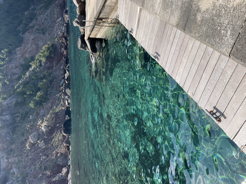 The image displays a coastal scene at Cala de Valldemossa, Valldemossa, Spain, under bright daylight. The foreground features clear, calm turquoise-emerald green water exhibiting visible submerged rocks and shimmering light patterns caused by surface ripples. Along the right side, a light-colored wooden pier, constructed from horizontally laid planks, extends into the midground. Three metal mooring cleats are affixed to the wooden pier, two in the immediate foreground. Adjacent to the wooden pier, a concrete walkway or platform is visible. Further along the concrete structure, a metal swimming ladder descends into the water. The background is dominated by a steep, rugged reddish-brown rocky cliff face, sparsely covered with green vegetation, including small trees, rising directly from the sea. Numerous large dark boulders are scattered along the base of the cliff and are partially submerged in the water. No people or active subjects are present in the frame.