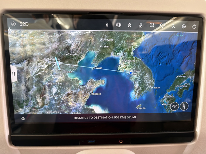 The image, captured in the city of Chaoyang District, China, depicts an in-flight entertainment (IFE) screen within an aircraft cabin. The screen displays a detailed satellite-style flight map of East Asia, encompassing eastern China, the Korean Peninsula, and surrounding sea areas. An light blue stylized airplane icon is positioned over mainland China, west-northwest of Beijing (labeled PEK). A thin white line, representing the flight path, extends from this airplane icon across the Yellow Sea towards Seoul, South Korea (labeled ICN). Prominent city labels visible include Beijing, Tianjin, Dalian, Qingdao, Shenyang, Pyongyang, Seoul, and Busan. The top left of the screen shows "S 52D", likely a seat identifier, alongside a small airplane icon. A status bar across the top right features various interface icons, including Bluetooth, Wi-Fi, headset, passenger services, airplane mode, a heart icon, a moon icon, settings (gear), and a power button. At the bottom center of the screen, the text "DISTANCE TO DESTINATION: 903 KM | 561 MI" is visible. A white "||" (pause) icon overlays the left side of the map. Indistinct reflections of at least two human figures are present in the upper portion of the glossy screen, indicating passengers seated behind the photographer. Below the screen, a dark bezel integrates a USB port (with a blue interior, suggesting USB 3.0 or later) and a 3.5mm audio jack, recessed into the surrounding light-colored panel of the aircraft seatback. The overall scene indicates an active flight in progress, with a passenger utilizing the IFE system.