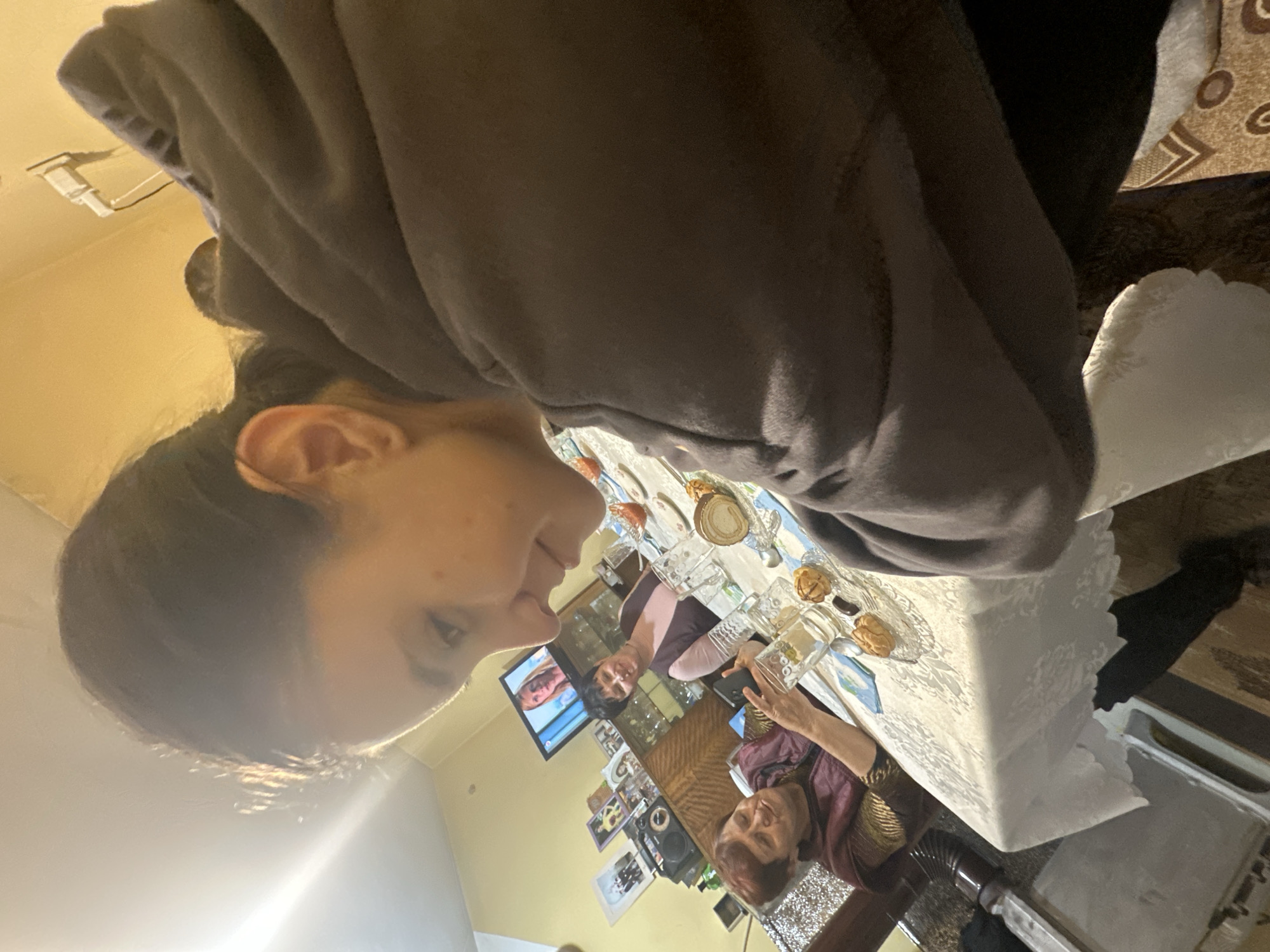 The scene depicts an indoor social gathering in the city of Letnitsa, Bulgaria, likely within a private residence's dining or living area. A table covered with a white, patterned tablecloth is central, surrounded by multiple individuals. In the immediate foreground, to the right, a person with dark hair pulled back, wearing a dark grey hooded sweatshirt, is partially visible in profile. Their head is tilted downwards and to the left, observing the table and other occupants. Across the table, an older woman with short, reddish-brown hair and a purple top with patterned gold sleeves is seated, holding a dark-colored smartphone with both hands, pointed towards the foreground. She has a slight smile. Adjacent to her, a woman with short dark hair, wearing a light brown v-neck top, is also seated at the table, smiling and looking towards the foreground. A fourth individual is partially obscured behind the foreground person's right shoulder. The table is set with clear glass tumblers, white plates, small blue and white placemats, silverware, and various pastries or small desserts. A golden-colored cup is also present. In the background, against a light yellow wall, a wooden display cabinet with glass doors is visible. On top of this cabinet, a flat-screen television displays a blonde female figure. To its left, a black boombox or stereo system, along with several framed pictures and decorative objects, are arranged. The room is illuminated by overhead artificial lighting, with a strong light source visible in the upper left. The floor on the right features a patterned rug in shades of brown and beige.