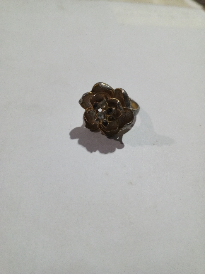 A single metallic ring with a prominent flower-shaped setting is depicted, resting on a flat, light-colored surface, likely white or off-white. The ring's band is a dull silver-grey, while the flower's petals exhibit a mottled texture with tarnished silver and bronze-gold tones. The flower's center contains several small, clear, possibly faceted stones, with some settings appearing empty or obscured. The ring casts a distinct shadow to its right and slightly behind it, indicating a light source from the upper left. The background surface is uniform but shows minor scuffs or discolorations. No people, actions, or interactions are visible. The specific location within Phakeo, Laos, is not discernible from the photographic evidence.