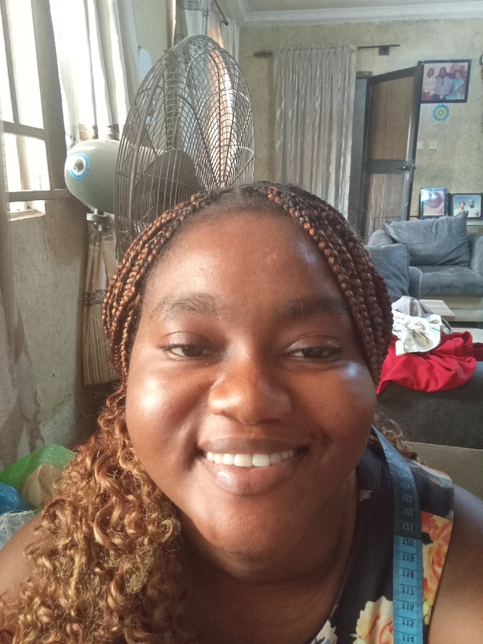 A female individual with dark skin, braided hair, and curly reddish-brown accents smiles directly at the camera in a close-up selfie taken within a residential interior in Makurdi, Nigeria