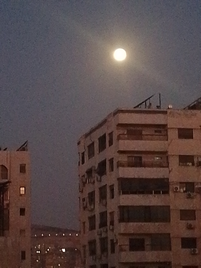 A low-angle shot captures a full moon in a dusky sky. Two multi-story apartment buildings flank the moon. The buildings, varying in height and style, are lit by ambient light and have multiple windows and balconies. Distant cityscape lights can be seen between the buildings. An antenna can be seen on top of one of the buildings.