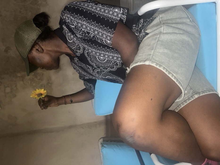 An individual is depicted seated from the mid-thigh up in Daurawa, Nigeria. The person, with dark skin, wears an olive-green mesh baseball cap and a short-sleeved black shirt patterned with white paisley designs, along with light-colored shorts. A small yellow flower with a dark center is held by the stem in their right hand, positioned near their face. Two bracelets, one beaded and one string-like, are visible on the right wrist. The individual is seated on a light blue cushioned chair, with a portion of a similar adjacent cushion visible to the left. Their left leg is crossed over the right, showing a mark on the left knee. The background consists of an unevenly textured, light brown wall.
