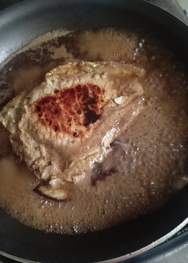 - "A close-up shot shows a piece of meat cooking in a dark brown sauce inside a black frying pan" by FM-wnq9E3, licensed under CC BY 4.0
