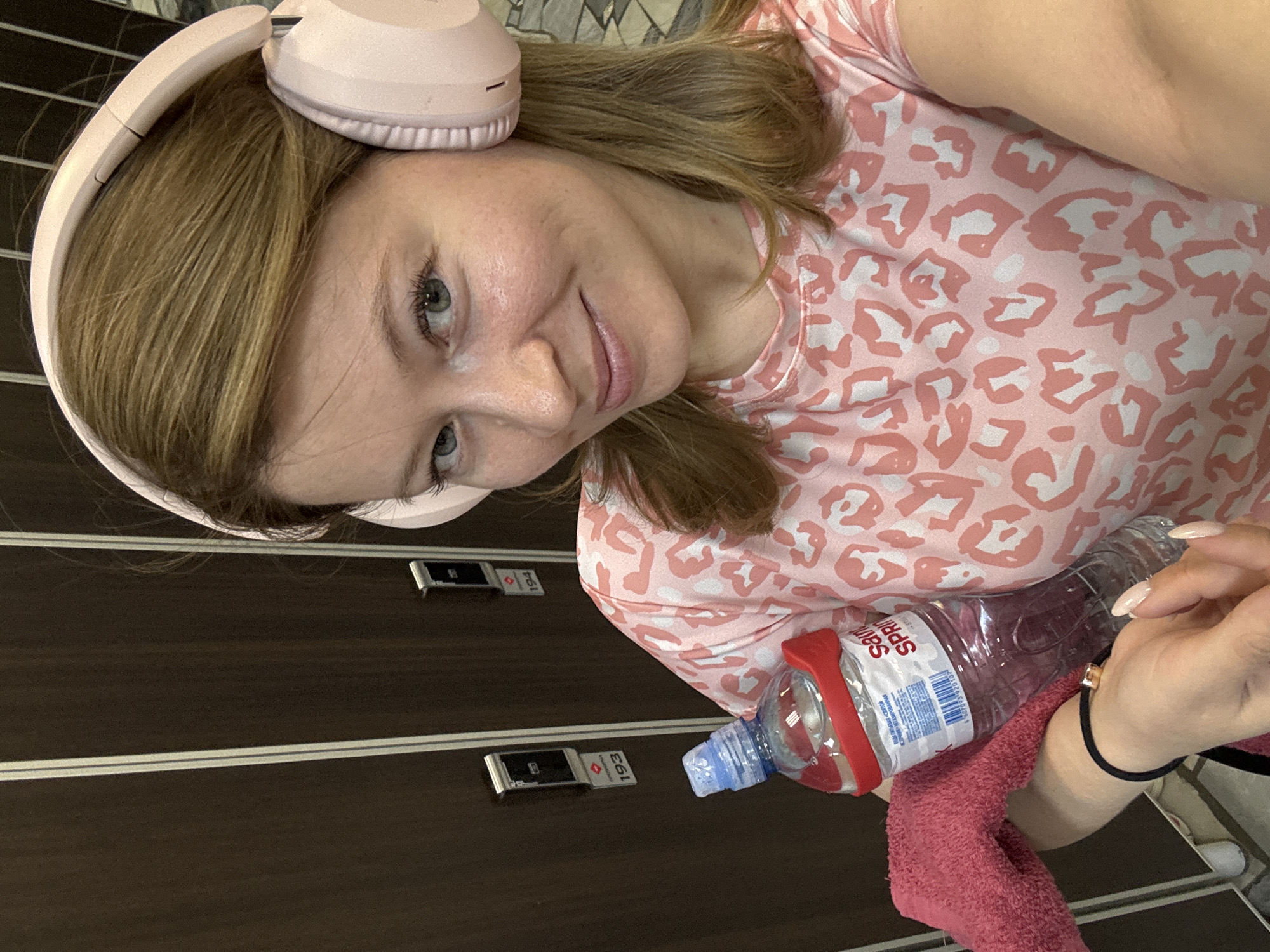 woman wearing pink headphones and a pink leopard-print shirt. She is holding a bottle of "Saint Springs" water and a pink towel. The background consists of a dark brown wall with silver-framed numbered lockers, indicating a changing room, possibly at a gym or recreational facility. Based on the water bottle's brand and the Cyrillic writing on the lockers, the location is likely in Russia. Based on that information I surmise the city is Chaikovsky, Russia. The woman is looking at the camera with a slight smile.