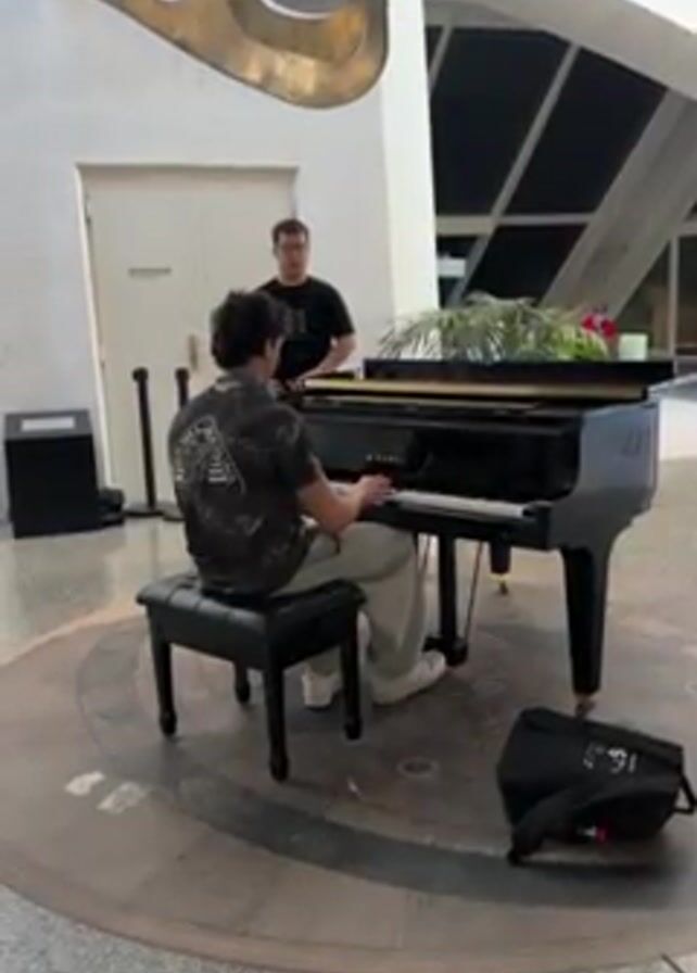 A young man is playing a black baby grand piano in a large open room with white walls and a circular, tile-like floor. Another man stands behind the piano, observing. A black backpack sits on the floor next to the piano stool. Decorative plants are on top of the piano. The room features modern architectural design.