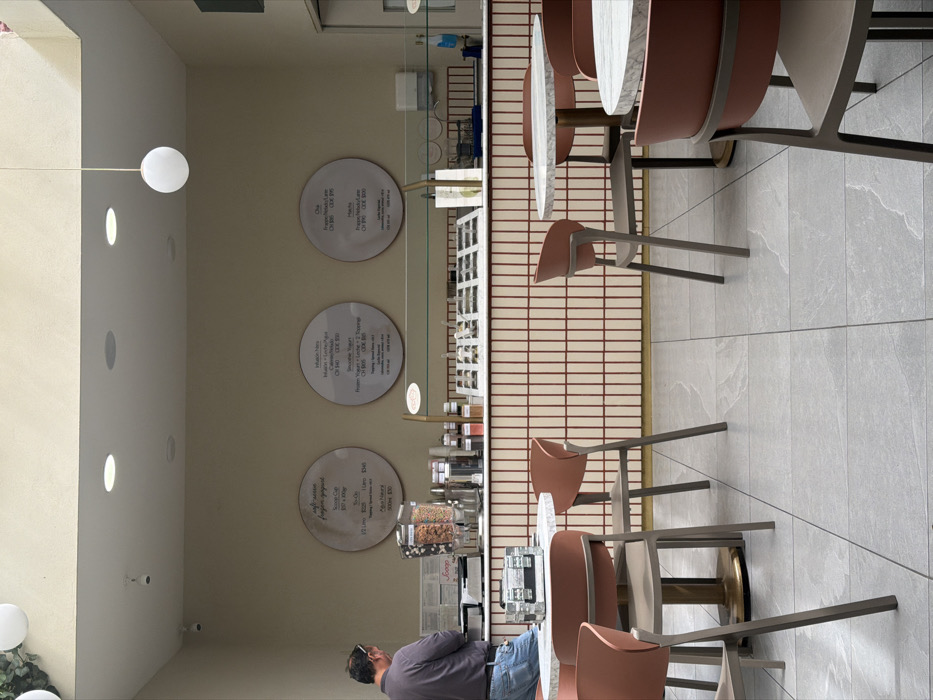 The image depicts the interior of a modern commercial establishment, likely a frozen yogurt or dessert shop, situated in Mexico City, Mexico. The precise location within the city is not identifiable from the image. The scene features a long service counter spanning the width of the background. The counter has a white surface and a base composed of vertically oriented cream-colored rectangular tiles separated by thin reddish-brown grout lines. Behind the counter, a man in a grey shirt and blue jeans stands, facing away from the camera, appearing to attend to an item on the counter to his left. To his right, a scale, two clear dispensers filled with cereal or granola, and various other containers and small objects are visible. A glass display case with multiple partitioned sections, presumably for toppings, runs along the counter. Above the counter, three large circular menu boards are mounted on a cream-colored wall. The left board lists "soft serve frozen yogurt" options and "Agua Natural," with prices indicated in Mexican Pesos (MXN). The middle and right boards display other beverage and dessert options like "Infusión Nero," "Smoothie Yoghurt," "Chai," and "Matcha." The foreground and midground present a customer seating area. Several round tables with white marble tops and dark-colored pedestals are arranged. Surrounding these tables are modern chairs featuring dark grey frames and reddish-brown or terracotta-colored seats and backrests. A metallic container is visible on a table in the left foreground. The floor is covered with large, light grey square tiles. The ceiling is high, with multiple recessed circular lights and one suspended spherical white pendant light. Natural light appears to enter from above, possibly through a skylight not fully visible in the frame. No other individuals are present in the seating area.