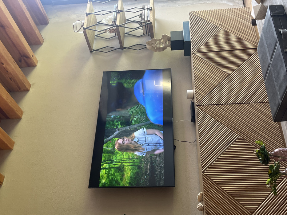 A television displays a scene with a red-haired woman in a white and blue outfit, set against a background of lush greenery. The TV is mounted on a wall next to a wooden cabinet with a geometric pattern. Above the TV, there's a decorative wine rack and a sculptural piece. Exposed wooden beams are visible in the upper left corner of the image.