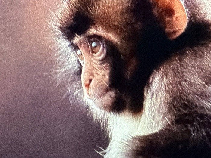A close-up, high-resolution image depicts a young macaque monkey, positioned with its head and upper body facing right