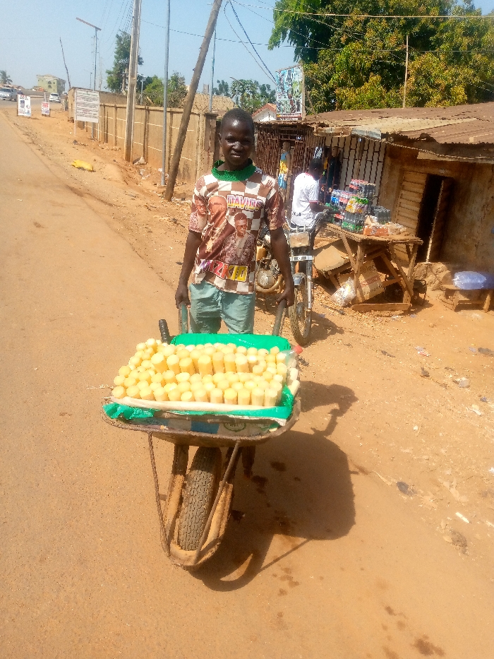 This image depicts a young male street vendor standing with a loaded wheelbarrow on a reddish-brown dirt road in Ube, Nigeria, under bright daylight