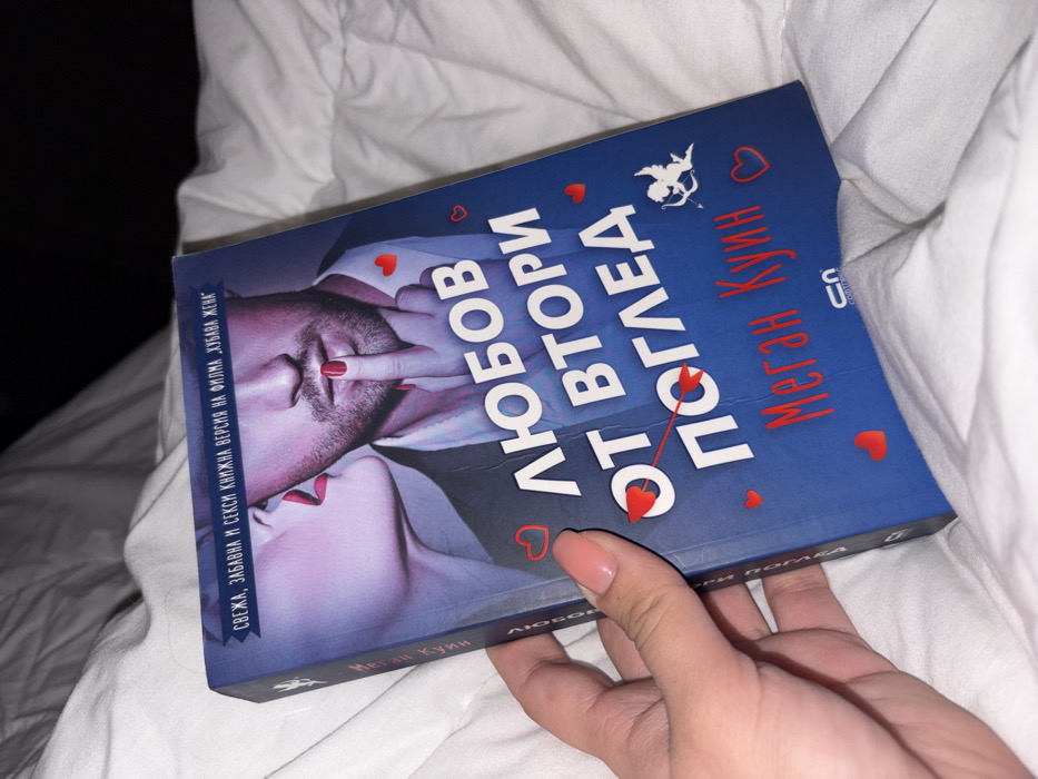 The image depicts a close-up, angled view of a person's left hand holding a book on a bed. The scene is located in Lukovit, Bulgaria. The hand has light skin and the fingernails are manicured with a peach-toned polish. The book is a paperback with a dominant blue cover. The title, in Cyrillic, reads "ЛЮБОВ ОТ ВТОРИ ПОГЛЕД" (Love at Second Sight), prominently displayed in white text. Below the title, the author's name "Меган Куин" (Megan Quinn) is written in red. The book cover illustration features the partial faces of a man and a woman in a romantic pose. The woman, on the left, is partially visible from the side, with red lips appearing to be close to the man's cheek. The man, with a beard and light skin tone, is centered, and his right index finger, with a red manicured nail, is placed vertically over his lips in a shushing gesture. Small red hearts are scattered across the cover, and a white silhouette of Cupid with a bow and arrow is visible in the lower right quadrant. Red arrows are also depicted striking through some of the "O" letters in the title. A line of text at the top reads, "СВЕЖА, ЗАБАВНА И СЕКСИ КНИЖНА ВЕРСИЯ НА ФИЛМА „ХУБАВА ЖЕНА“" (FRESH, FUN AND SEXY BOOK VERSION OF THE FILM "PRETTY WOMAN"). The background consists of rumpled white bedding, likely a duvet or comforter, indicating an indoor setting. The lighting suggests a warm, possibly dim, environment, with some shadows visible on the bedding. No other individuals or distinguishing objects are visible within the frame.