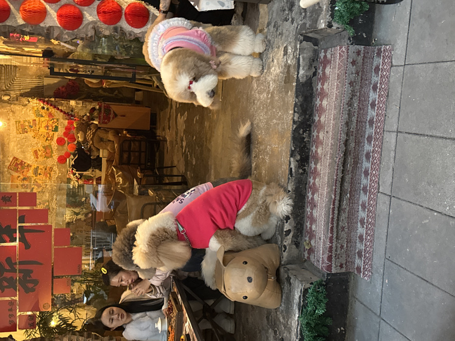 An evening street view depicts the entrance to a brightly lit establishment in Longta, China. Two concrete steps lead up from a grey tiled pavement to the building's threshold. A patterned rug, featuring red, grey, and white geometric designs, covers the upper step. Two fluffy, light brown and cream-colored dogs are positioned on the upper step. The dog on the left wears a solid red shirt and a metal chain collar; it is seated next to a light brown, cartoonish animal-shaped stool or toy. The dog on the right wears a pink ruffled dress and has small red bows affixed near its eyes; it is standing, facing slightly left. Behind the dogs, through a large glass window adorned with red Chinese characters, two adult females are visible seated at a dining table inside. The woman on the left, with dark hair, wears a light-colored fluffy jacket and observes the scene. The woman on the right, with dark hair secured by a yellow clip, is raising a cup to her mouth. Food items in various dishes are arranged on their table. The interior of the establishment is warmly illuminated. Its walls are decorated with numerous yellow and orange papers, and red honeycomb lanterns are visible both inside and possibly outside on a stone wall to the right. A large brown stuffed bear and additional red banners are also present inside. The lighting suggests dusk or nighttime conditions.