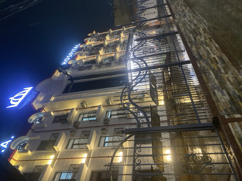 The image captures the exterior of the AKFA Medline Hospital in Tashkent, Uzbekistan, at night