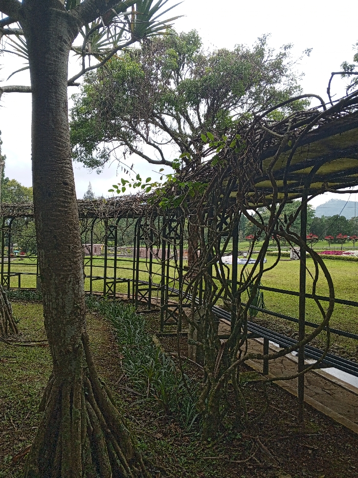 A weathered arbor, draped with climbing vines, stands within a verdant landscape. A textured tree trunk dominates the foreground, its base revealing a network of roots. A row of plants lines the arbor's base. Beyond the arbor, a vast green lawn leads to distant trees and possibly a landscaped garden. The scene is overcast, casting a soft, muted light across the composition. The arbor is of an aged metal construction.