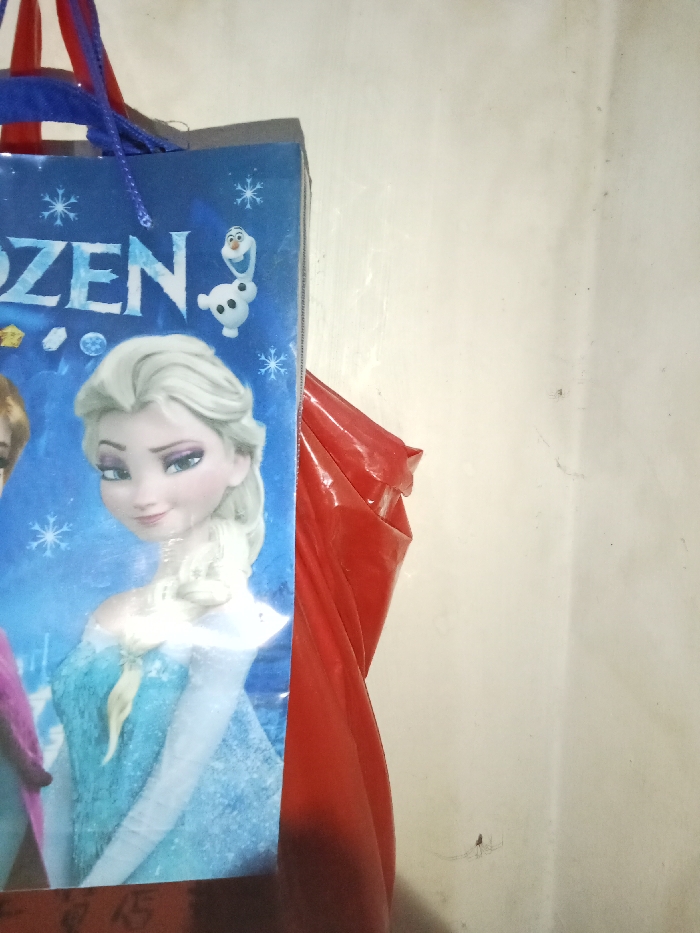 An indoor scene in Inxuba Yethemba Nu, South Africa, displays a blue paper gift bag positioned on the left side of the frame. The bag features characters from Disney's "Frozen," with Princess Elsa prominently centered, smiling, and wearing a light blue dress. Part of another character (likely Anna) is visible on Elsa's left. Above Elsa, the character Olaf is depicted. The word "ZEN" from "FROZEN" is visible at the top left, amidst snowflake patterns. Blue string handles are attached to the top of the bag. A red and purple strap is visible above the blue handles. To the right of the blue bag, a crumpled, glossy red plastic object is partially visible. The background consists of a plain, light-colored wall with minor marks. No human figures are present.