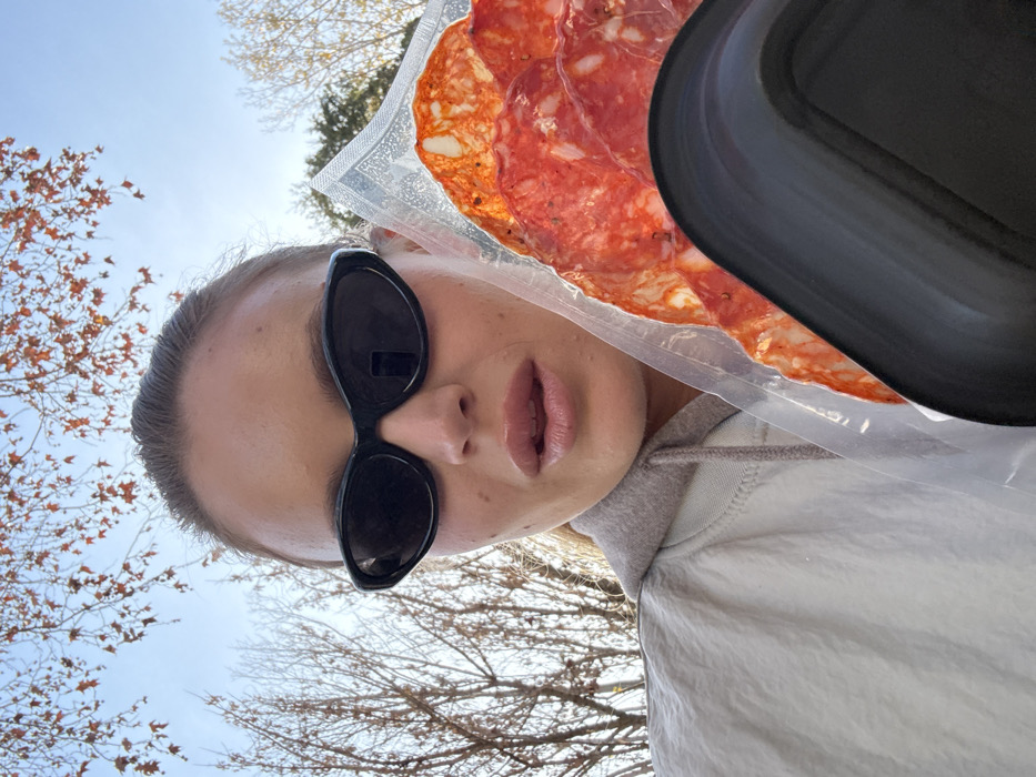 A female subject is depicted in a close-up outdoor portrait, located in Anzio, Italy. She wears black, elongated cat-eye sunglasses and has light-colored, glossy lips. Her hair is pulled back from her face. She is dressed in a light grey or beige jacket over a grey hooded sweatshirt, with the hood and drawstrings visible at the neck. The subject is holding a vacuum-sealed clear plastic package containing multiple circular slices of cured orange-red sausage, consistent with salami or chorizo, which display visible specks of herbs or spices. A dark, possibly black, object is partially visible beneath the packaged meat on the right side of the frame. The background consists of a clear blue sky and deciduous trees with bare branches; some upper branches retain scattered orange-brown autumnal leaves.