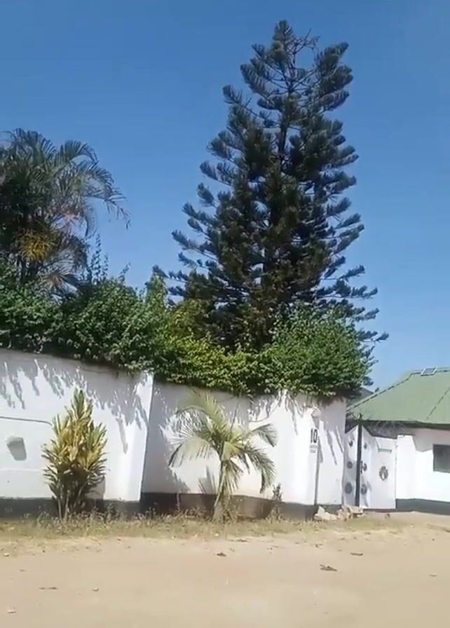 The camera is positioned at street level, capturing a view of a white-walled property on a sunny day. A tall, coniferous tree dominates the frame, standing adjacent to the wall. The wall is topped with dense green foliage. A small palm tree is situated in front of the wall, near a sign with the number "10" on it. To the right, a small white building with a green roof is visible. The foreground consists of a sandy or dirt ground area. The sky is clear and blue. The camera remains mostly still throughout the short video. The only action involves subtle shifts in the camera's orientation, possibly due to someone holding the recording device.